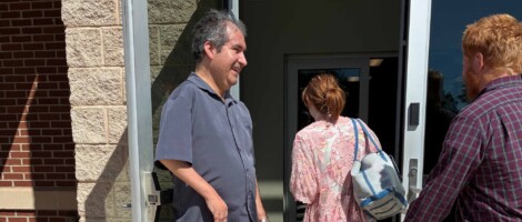 Victor Reta serving as a greeter prior to Sunday worship service.